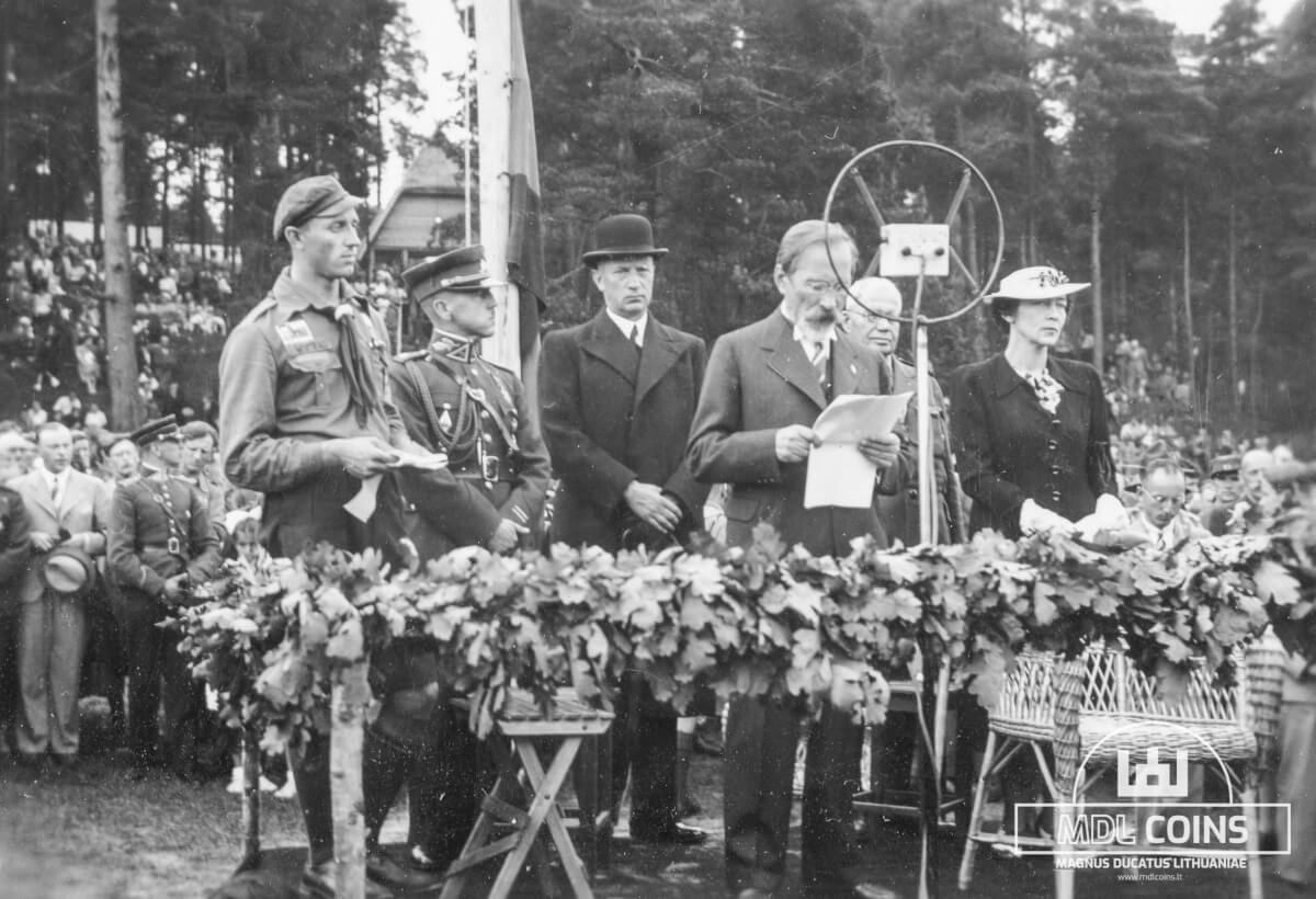 Antrosios Lietuvių skautų tautinės stovyklos metu Lietuvos Respublikos Prezidentas Antanas Smetona sako sveikinamąją kalbą – 1938 metai – Drobė (su porėmiu / be porėmio)