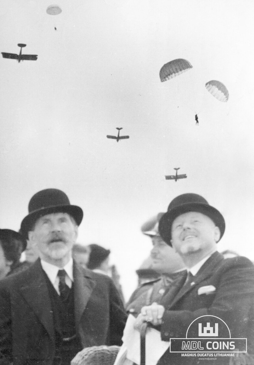 Lietuvos Respublikos Prezidentas Antanas Smetona ir Lietuvos aeroklubo pirmininkas prof. Zigmas Žemaitis stebi aviatorių pasirodymą – Drobė (su porėmiu / be porėmio)
