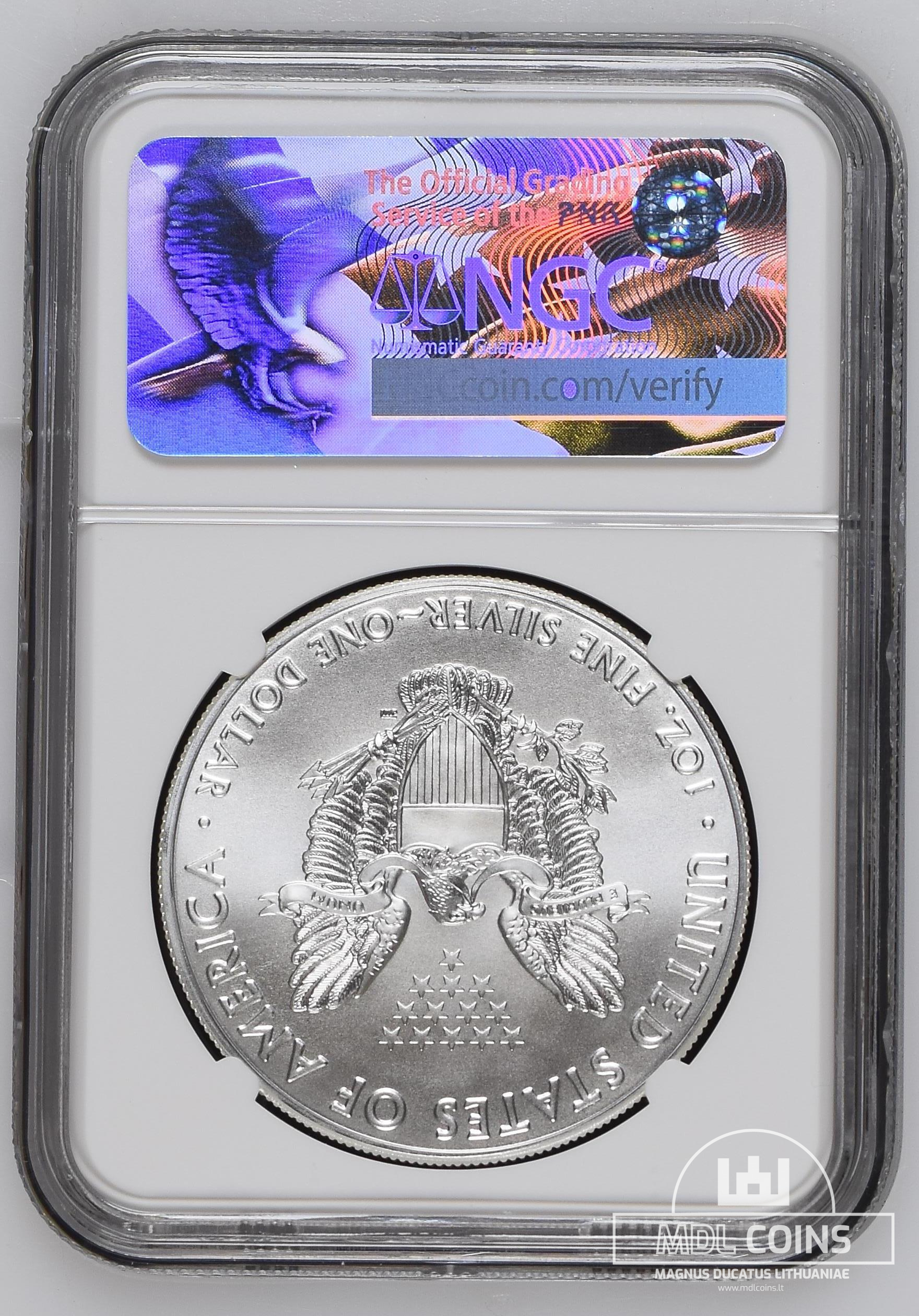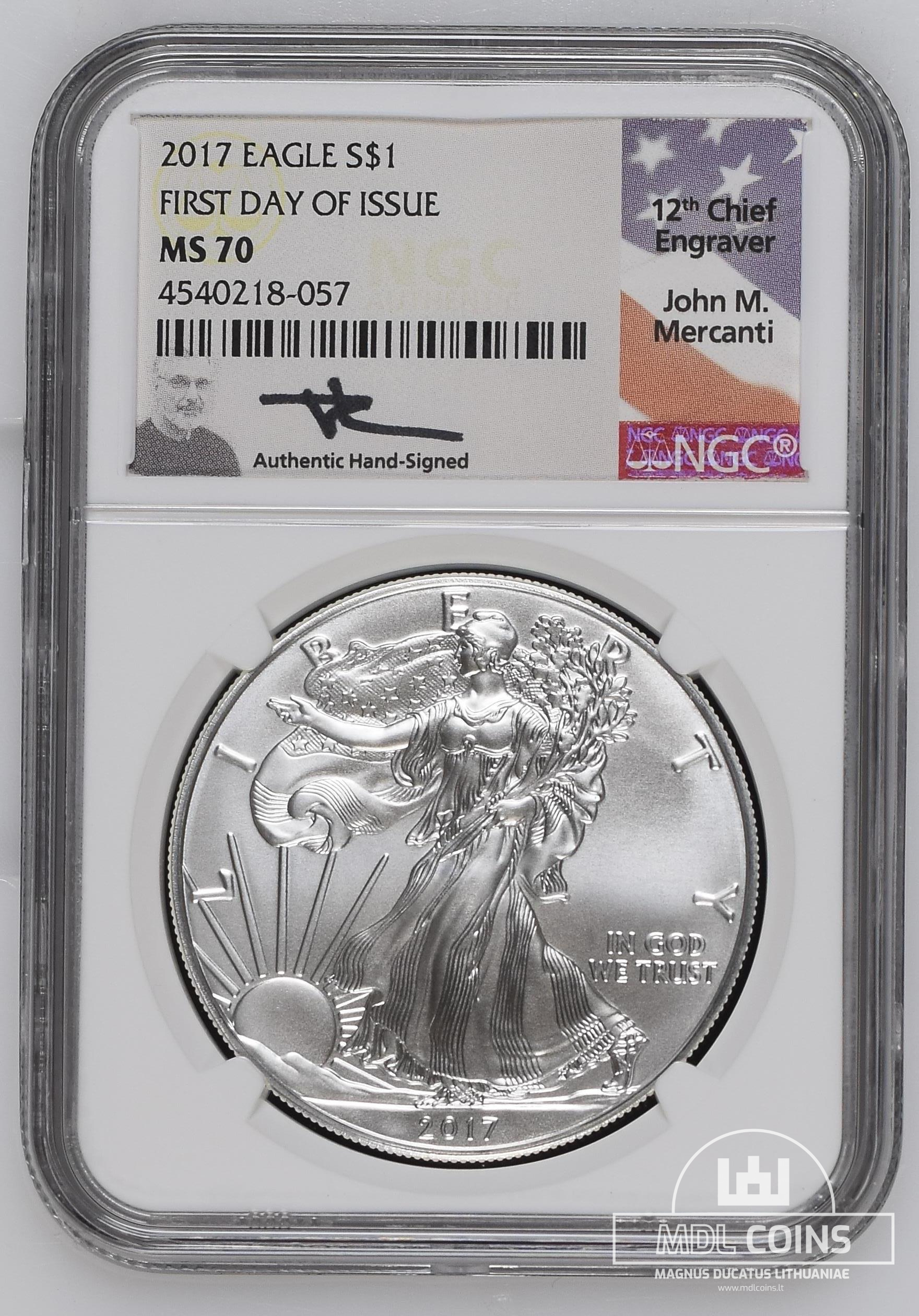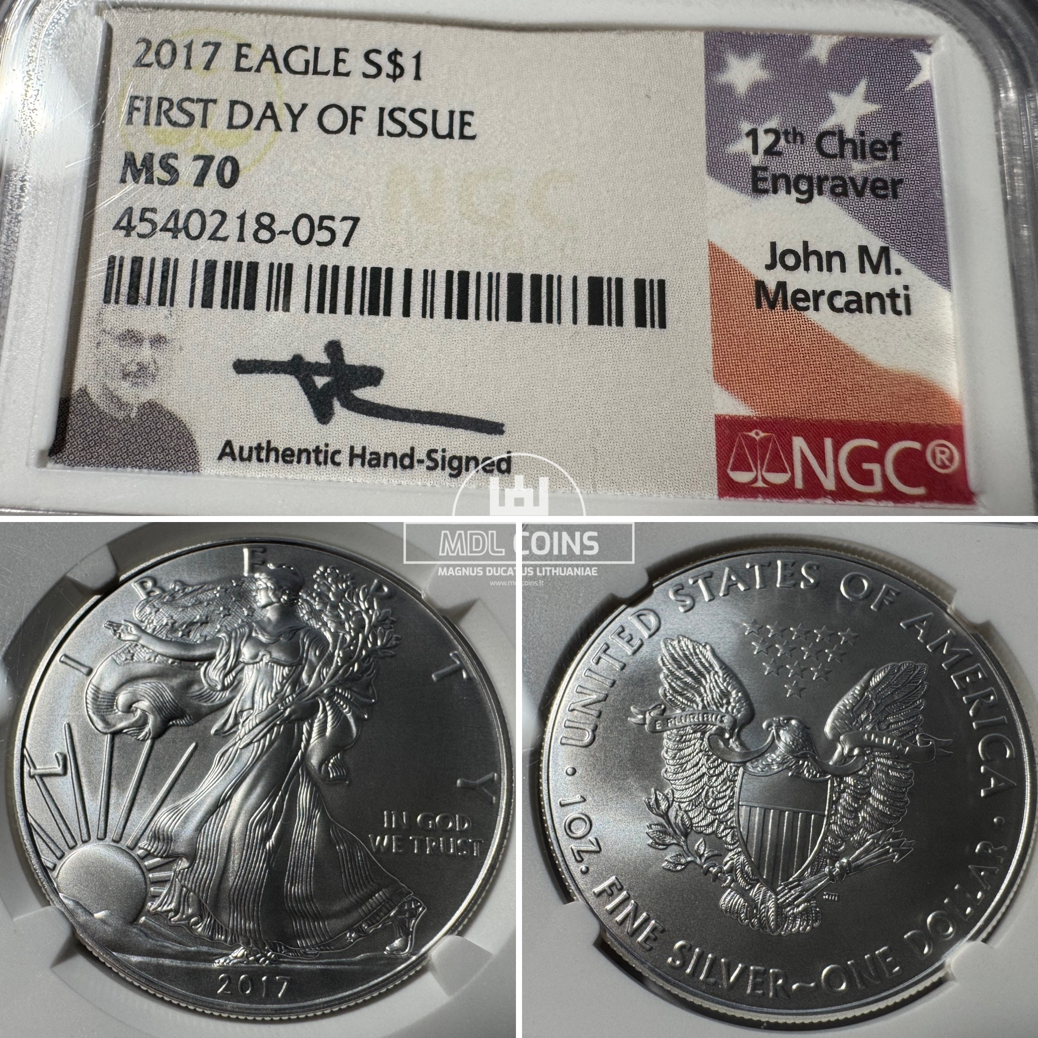 JAV – 2017 metų 1 doleris – „Silver Eagle” – NGC MS70 – FIRST DAY OF ISSUE + signature John M. Merchanti – (Sidabras 999 / 31,1 g)