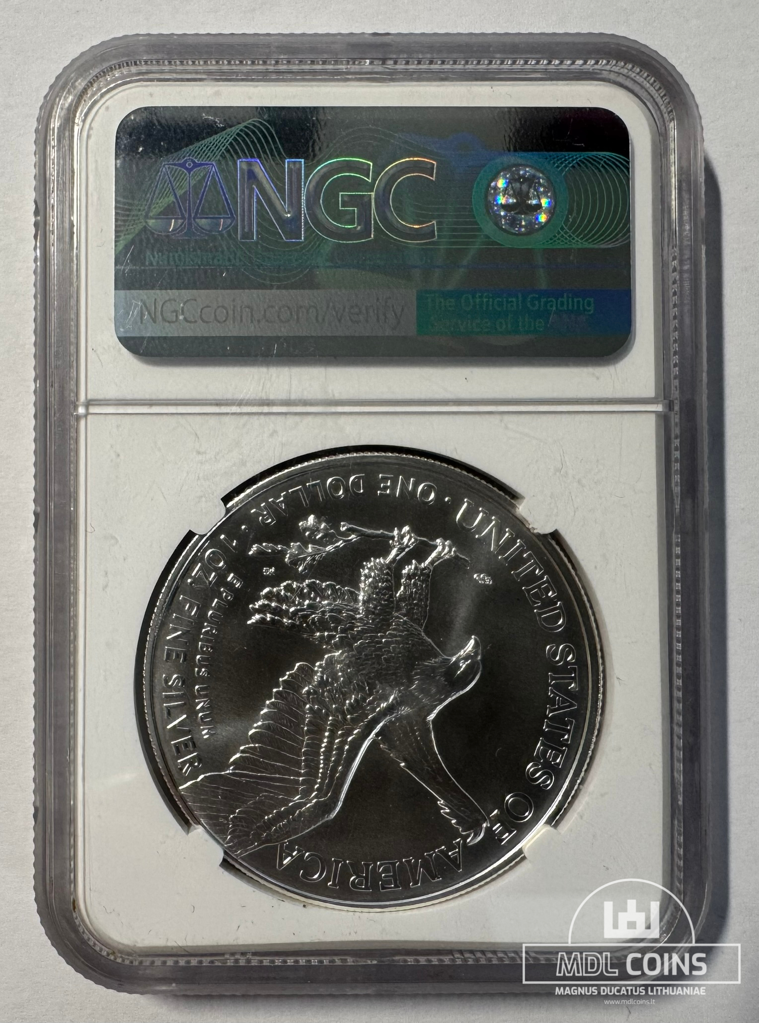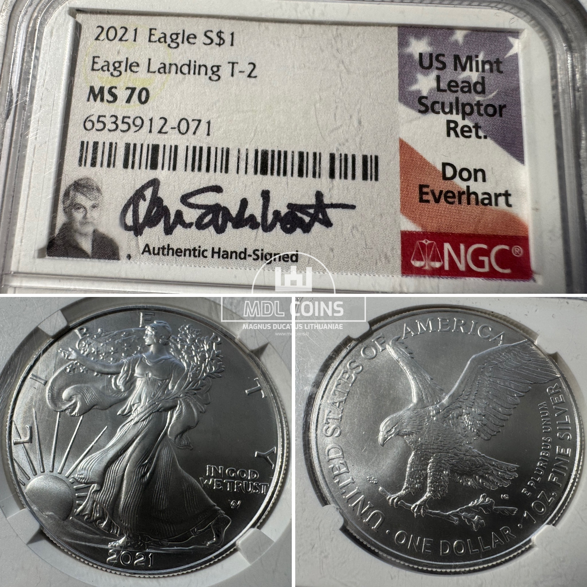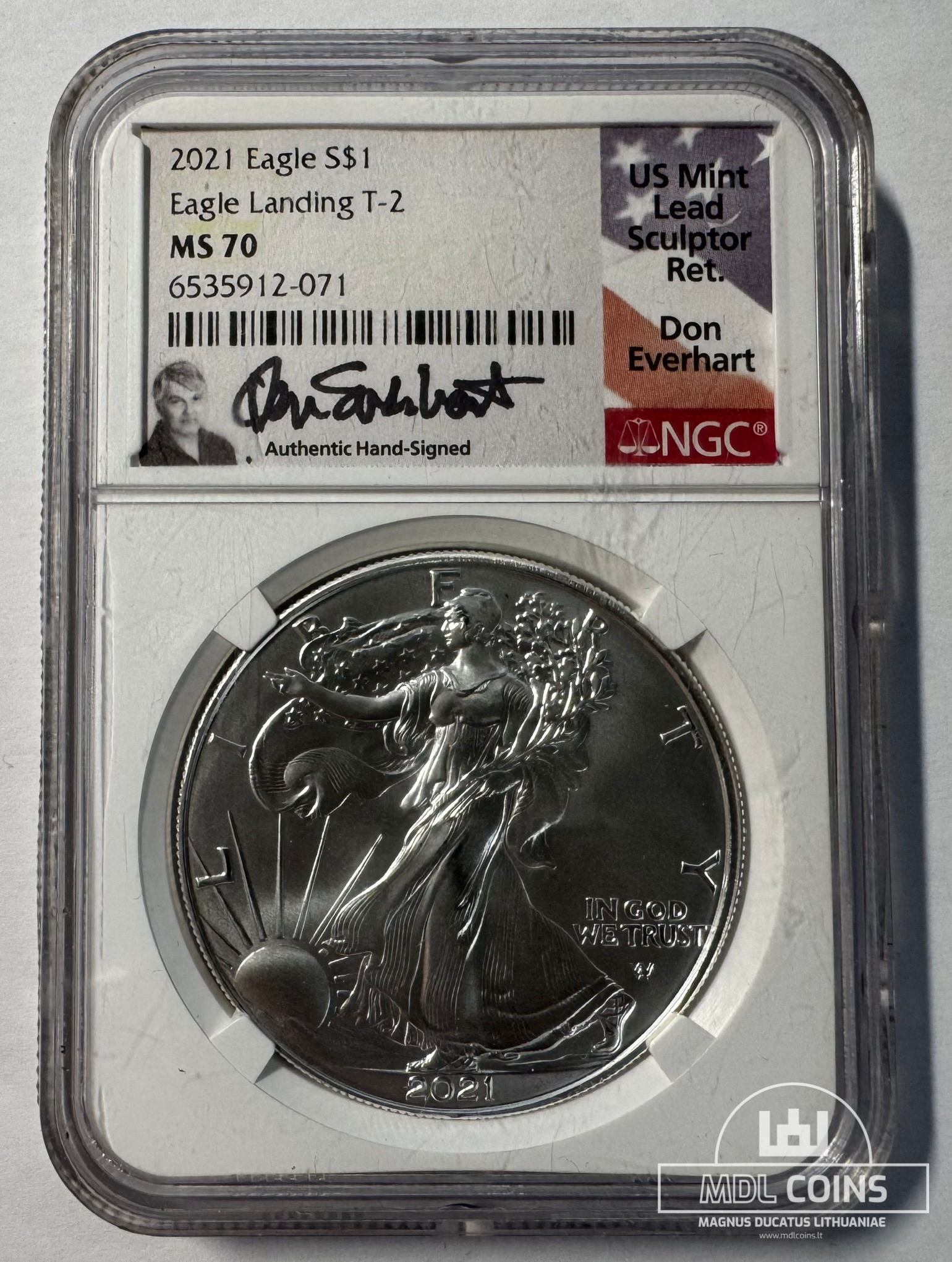 JAV – 2021 metų 1 doleris – „Silver Eagle” (Eagle Landing T-2) – NGC MS70 + signature Don Everhart – (Sidabras 999 / 31,1 g)