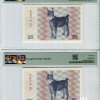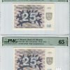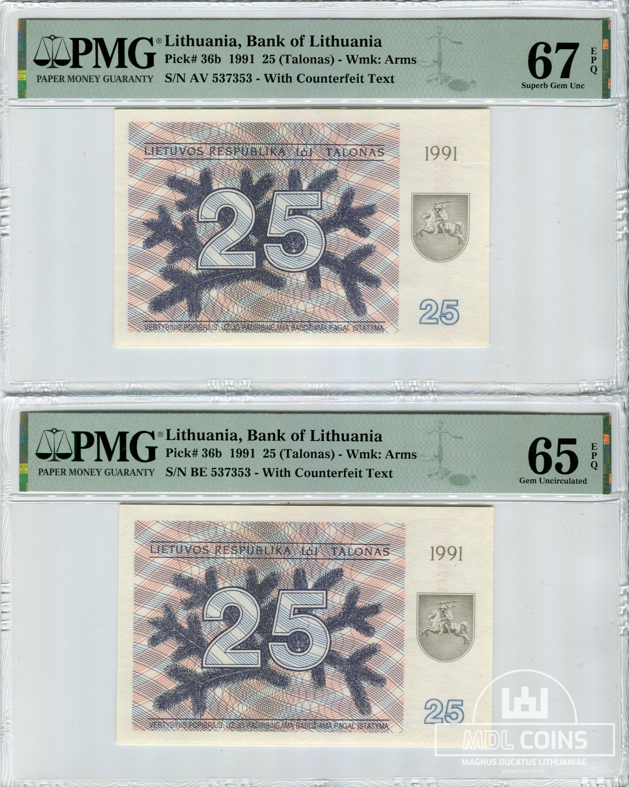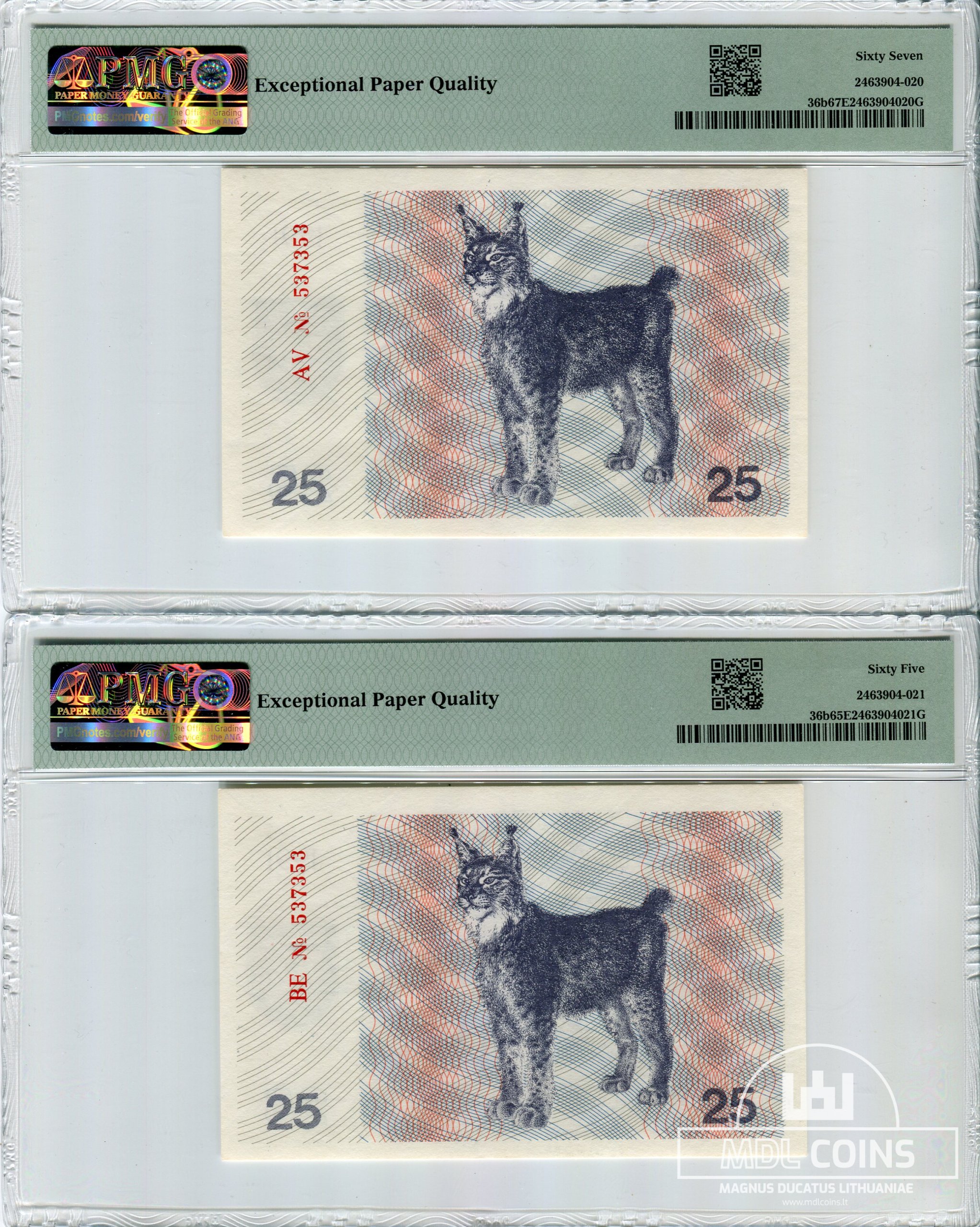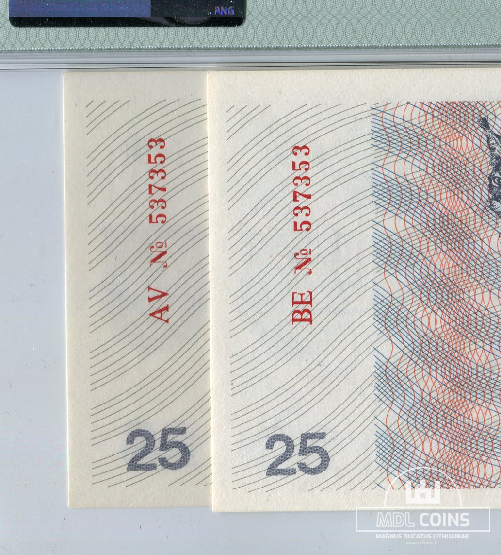 1991 metų 2 x 25 talonai (su užrašais) – AV/BE serijos + vienodi serijos nr. – PMG 67/65 EPQ