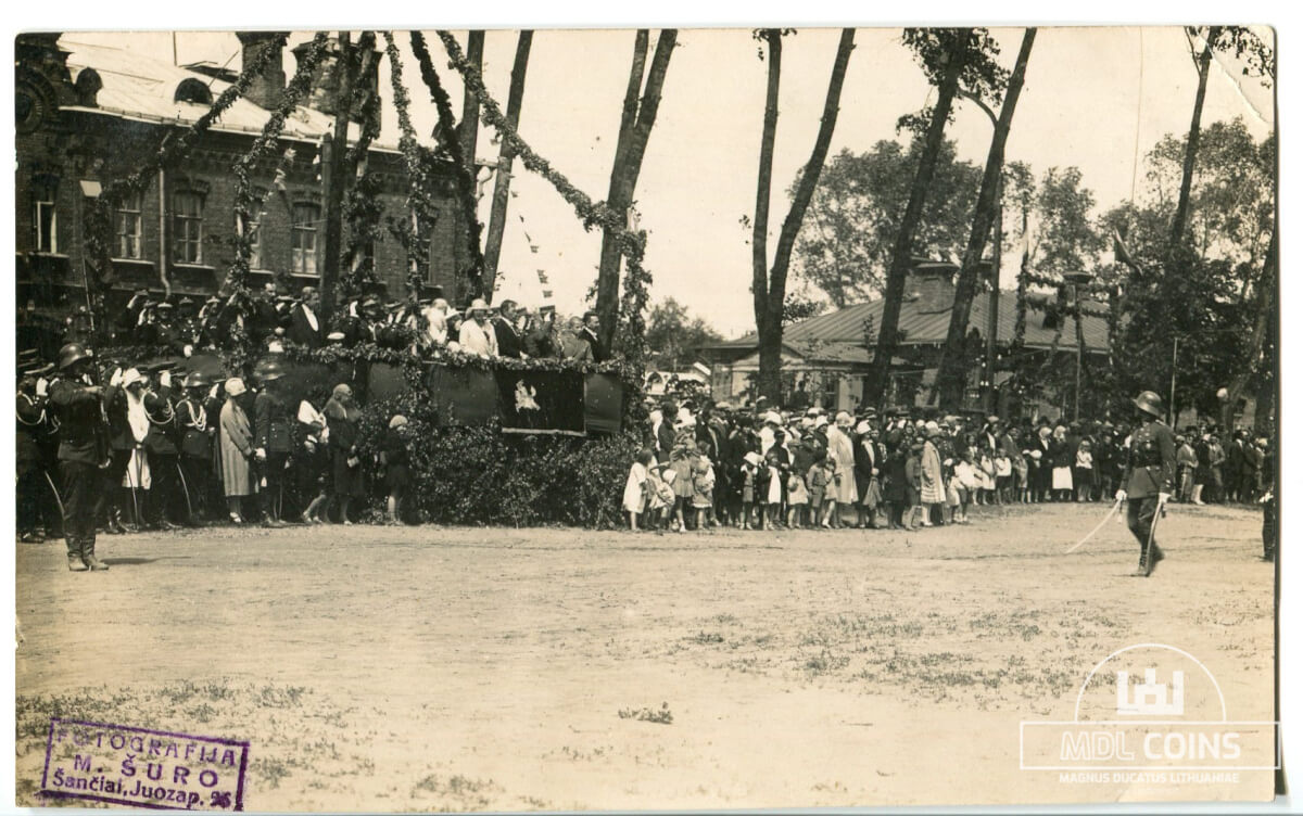 Antanas Smetona su kariuomenės atstovais iš tribūnos stebi šventinį paradą – 8,7 x 14 cm