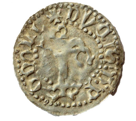Podolės kunigaikščio Konstantino Karijotaičio bedatis pus- grašis su pilnu LDK herbu – Šv. Jurgiu ir slibinu. Kaldintas 1388 m.